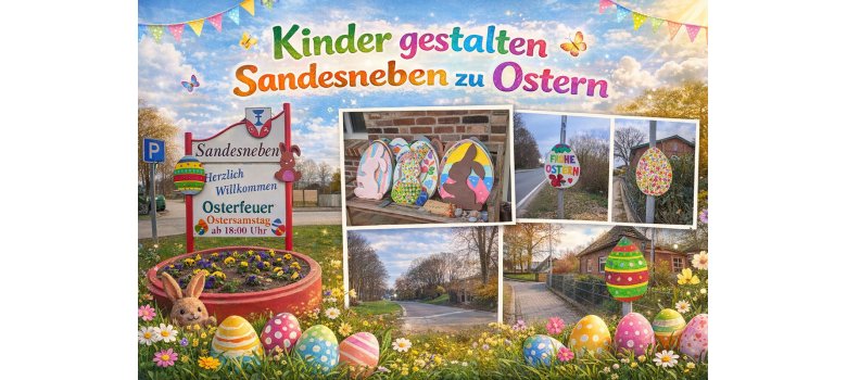In diesem Jahr gibt es zu Ostern etwas ganz Besonderes: Überall im Dorf sind liebevoll gestaltete Osterhasen und bunte Ostereier zu entdecken. Für diese kreativen Meisterwerke danken wir herzlich den Kirchenmäusen, Susis Kindergarten sowie der Grundschule Sandesneben mit ihrer OGS. Ein großes Dankeschön an alle Kinder für eure wunderbaren Osterbilder – mit eurer Unterstützung ist unser Dorf wieder festlich und farbenfroh geschmückt.